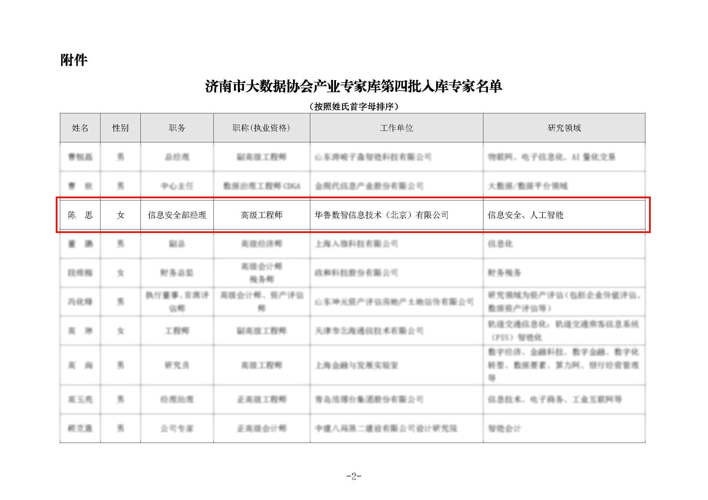 近日,济南市大数据协会公布第四批大数据产业专家库名单。经过严格评审与选拔,华鲁数智信息技术(北京)有限公司信息安全部经理陈思成功入选。