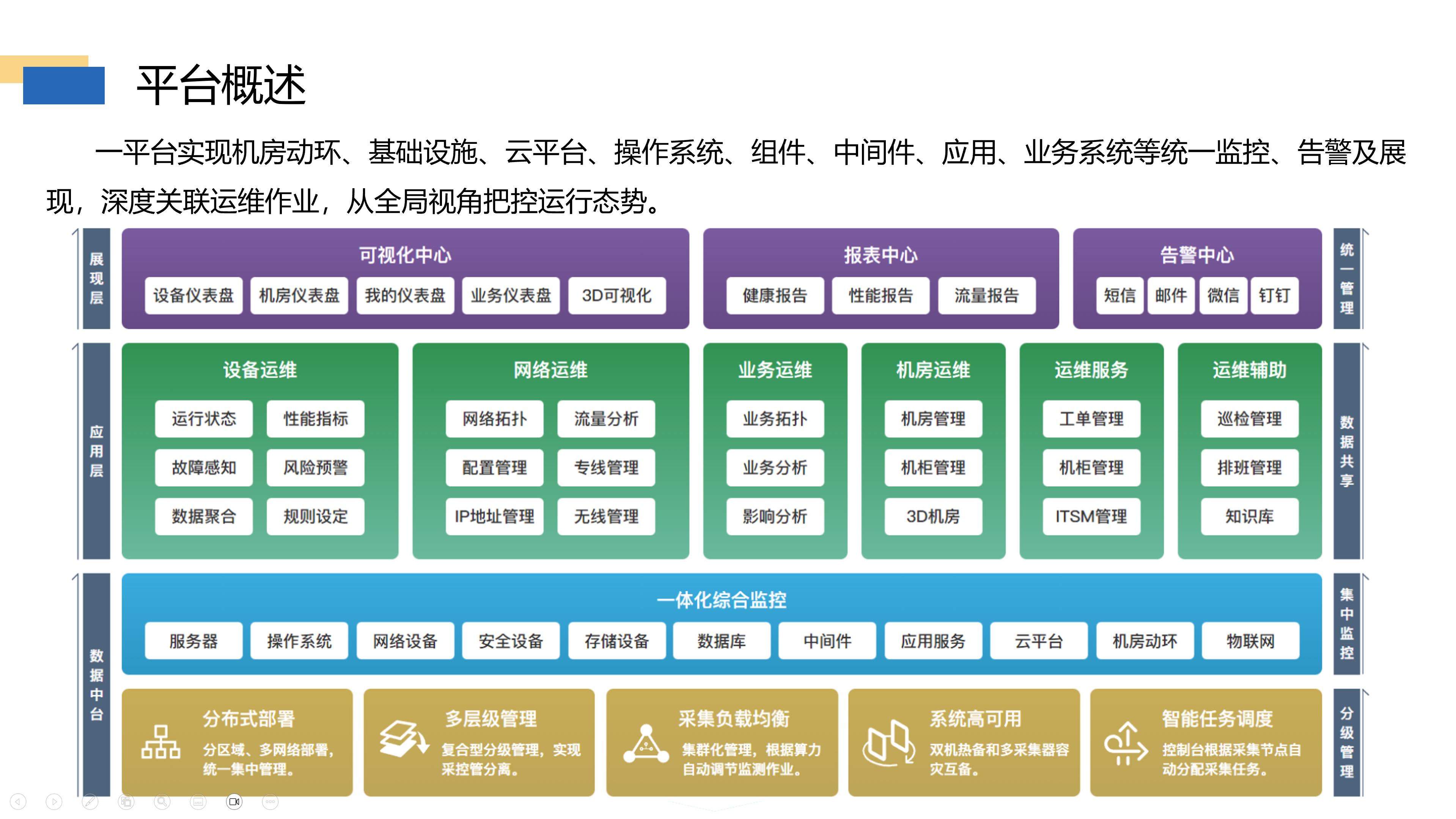 机房一体化监控平台以自动化运维为核心,保障业务的持续稳定运行,筑牢客户方信息化运维防线。有效提高运维效率,快速定位故障根源,保障终端安全与远程自动化运维,体现信息化建设与运维的价值。